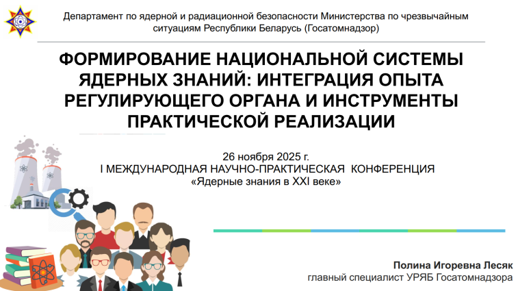Презентация доклада главного специалиста УРЯБ Госатомнадзора Лесяк Полины Игоревны на 1-й Международной научно-практической конференции "Ядерные знания в XXI веке", состоявшейся 26 ноября 2025 г. на базе Института ядерных проблем БГУ (Минск, Беларусь).
