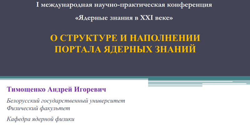 Презентация доклада заведующего кафедрой ядерной физики физического факультета Белгосуниверситета, канд.физ.-мат.наук Тимощенко Андрея Игоревича на 1-й Международной научно-практической конференции "Ядерные знания в XXI веке", состоявшейся 26 ноября 2025 г. на базе Института ядерных проблем БГУ (Минск, Беларусь).