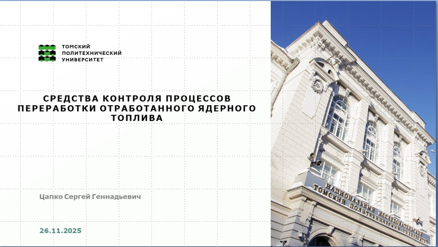 Презентация доклада директор научно-образовательного центра топ-инженерии в сфере информационных технологий, канд. техн. наук Цапко Сергея Геннадьевича на 1-й Международной научно-практической конференции "Ядерные знания в XXI веке", состоявшейся 26 ноября 2025 г. на базе Института ядерных проблем БГУ (Минск, Беларусь). Доклад представлен от авторского коллектива Томского политехнического университета.