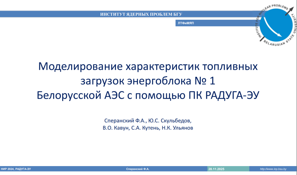 Презентация доклада старшего научного сотрудника лаборатории теоретической физики и моделирования ядерных процессов НИИ ЯП БГУ Сперанского Филиппа Александровича на 1-й Международной научно-практической конференции "Ядерные знания в XXI веке", состоявшейся 26 ноября 2025 г. на базе Института ядерных проблем БГУ (Минск, Беларусь). Доклад представлен от авторского коллектива НИИ ЯП БГУ.