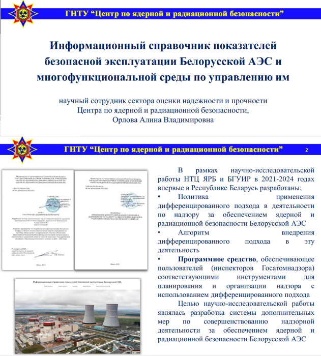 Презентация доклада ведущего инженера сектора детерминистического и вероятностного анализа отдела ядерной безопасности Государственного научного технического учреждения «Центр по ядерной и радиационной безопасности» Орловой Алины Владимировны на 1-й Международной научно-практической конференции "Ядерные знания в XXI веке", состоявшейся 26 ноября 2025 г. на базе Института ядерных проблем БГУ (Минск, Беларусь).