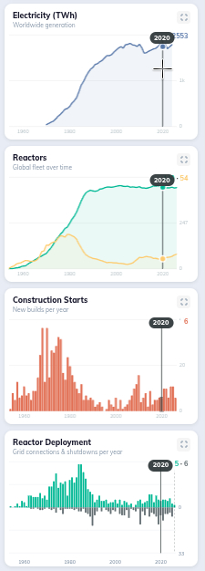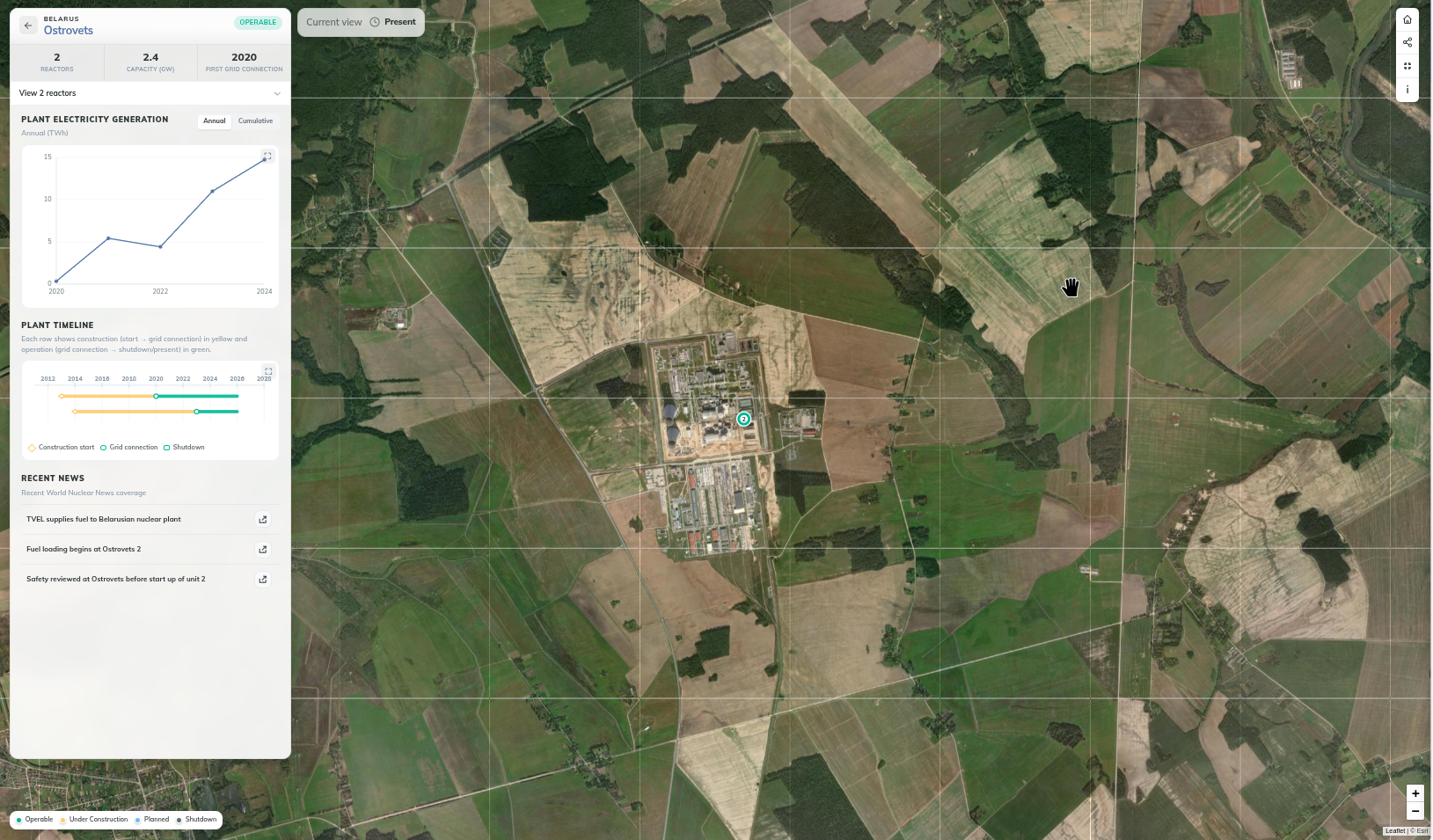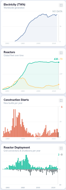Интерактивная карта предоставляет подробную информацию об атомных электростанциях мира. Используйте ползунок года, чтобы отслеживать эволюцию мирового парка атомных электростанций с 1954 года по настоящее время, фильтруйте данные по состоянию и мощности станций, а также изучайте статистику, диаграммы и хронологии на уровне стран и станций.