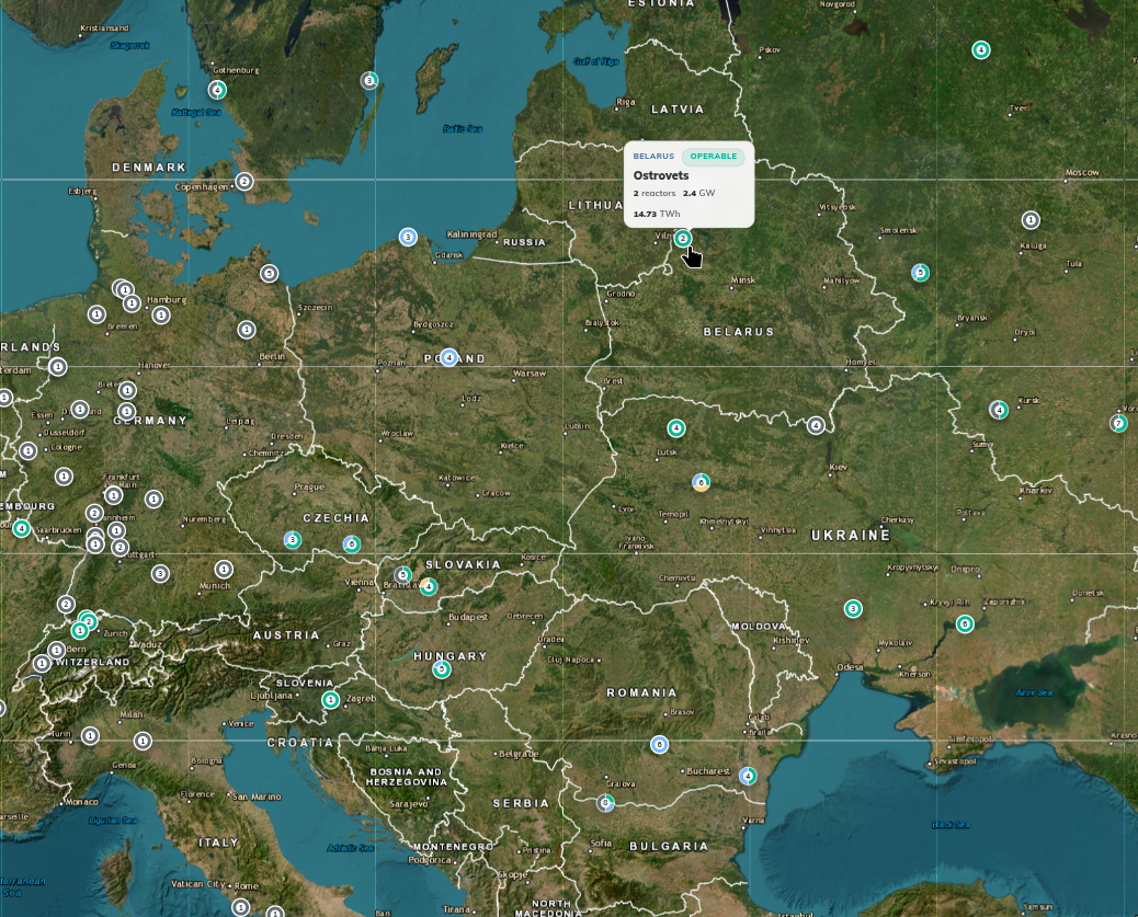 Копия экрана карты "Nuclear Power Plant Explorer" с выделенной на карте Белорусской АЭС, снабженной всплывающей подсказкой