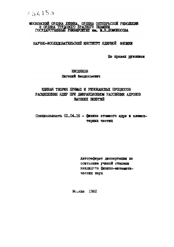 Единая теория прямых и резонансных процессов расщепления ядер при дифракционном рассеянии адронов высоких энергии: (01.04.16): Автореф. дис. на